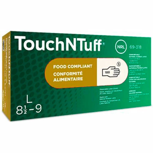 TouchNTuff® 69-318 is a lightweight latex glove that offers textured fingers and superior tactile sensitivity for easy handling of small objects and delicate instruments. Powder-free latex disposable gloves with textured grip are ambidextrous. They provide the highest degree of dexterity available with the strength and comfort of 100% natural rubber latex. Complies with FDA food handling requirements. For laboratory analysis/technical work, intricate parts handling, food processing and handling, quality control, electronics assembly, light-duty maintenance and cleanup.