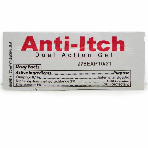 Anti-Itch Dual Action Gel Pouch stops the itch. When insects bite or poisonous plants strike, Anti-Itch provides relief fast. Contains Diphenhydramine Hydrochloride and Zinc Acetate.