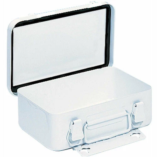 Durable drawn metal cover and body. Cover is welded to body using a full piano hinge with a rust resistant hinge pin and holds 10 standard prepackaged first aid units. Meets rigid government specifications. Cover opens 90 degrees for use as a shelf and one piece cover gasket is included and keeps moisture out. (2) positive pull-down catches and convenient carrying handle with wall mounting hanger with keyhole slots. Interior is open; no partition. Sold without contents. Finished with a durable white powder coat finish. Sold in package quantity.