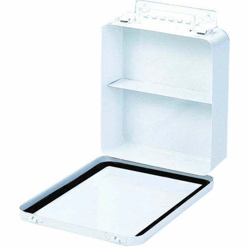 Durable drawn metal cover and body while cover is welded to body using a full piano hinge with a rust resistant hinge pin. Holds 24 standard prepackaged first aid units and meets rigid government specifications. Cover opens 90 degrees for use as a shelf and one piece cover gasket is included and keeps moisture out. There are 2 positive pull-down catches and a convenient carrying handle with a wall mounting hanger with keyhole slots. Center partition is welded in place. Sold without contents. Finished with a durable white powder coat finish. Sold in package quantity.