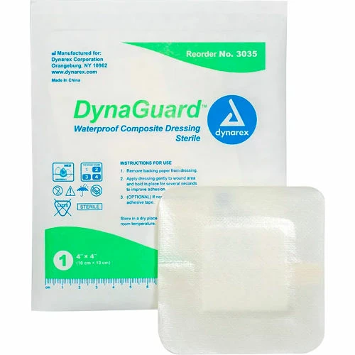 Dynarex’s DynaGuardWaterproof Dressing is a sterile, multi-layered foam dressing that provides a warm moist healing environment. The waterproof top layer acts as a bacterial barrier, protecting the wound from any outside liquids that can cause infection. The inner foam layer absorbs drainage, while the low-adherent contact layer and adhesive non-woven fabric border provide protection to the wound bed and are gentle on the skin. Composite dressings can be used as a primary or secondary dressing to help treat patients with acute or chronic wounds such as pressure sores, leg ulcers, and withdrawn I.V. sites of partial to full thickness at wound stages 2, 3, and 4.Ingredients: PU film (0.015mm thickness – transparent), medical non-woven fabric, absorbent cotton pad, medical pressure-sensitive adhesive (acrylic adhesive), glassine paper