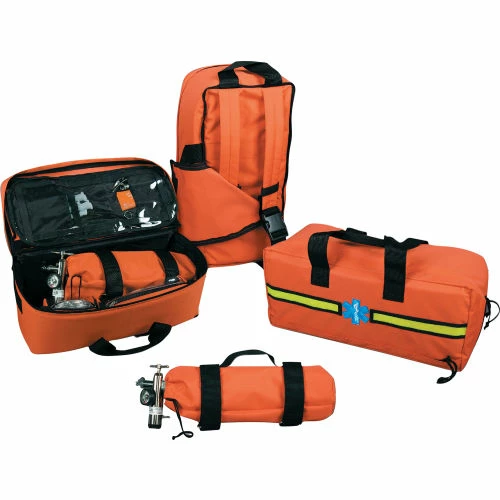 A drawstring oxygen carrying bag with web carrying handles is also included. The pack has a star of life reflective emblem on front and yellow reflective trim on the front and the sides. Measures 23″L x 12″W x 9″H.