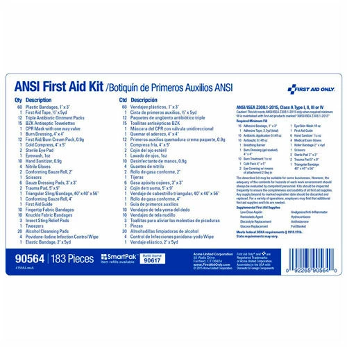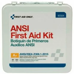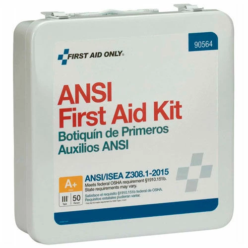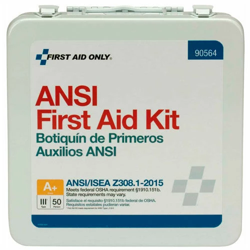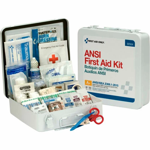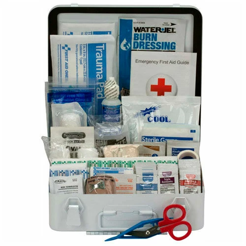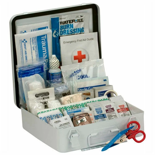 Weatherproof case comes with a carrying handle and is wall mountable. Contents exceed the 2015 ANSI Class A requirements and are sufficient to treat 50 or more people.