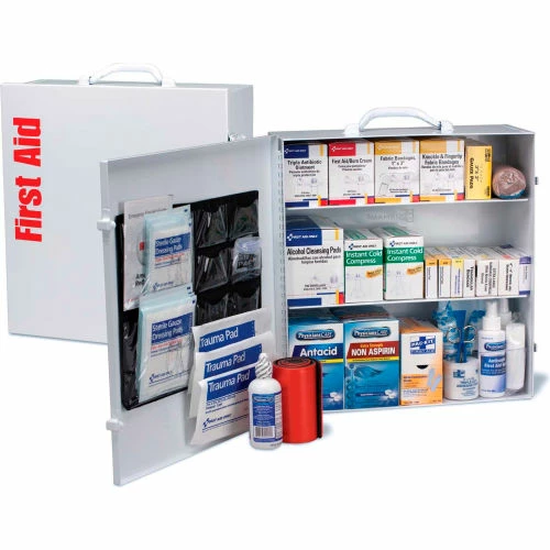 Solid steel case comes with a carrying handle and is wall mountable. Contents exceed the 2015 ANSI Class B requirements and are sufficient to treat 100 to 150 people.
