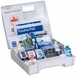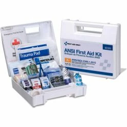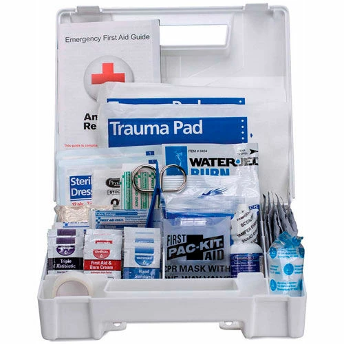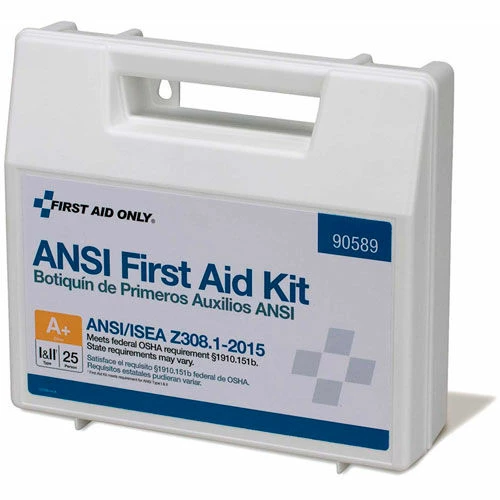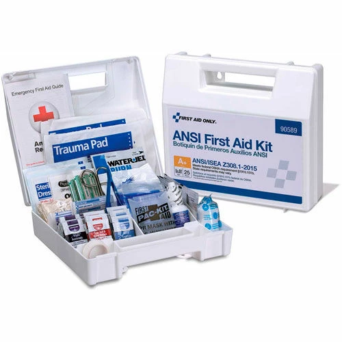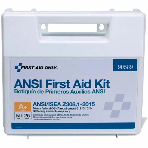 Plastic, organized case comes with a carrying handle and is wall mountable. Contents exceed the 2015 ANSI Class A requirements and are sufficient to treat 25 or more people.