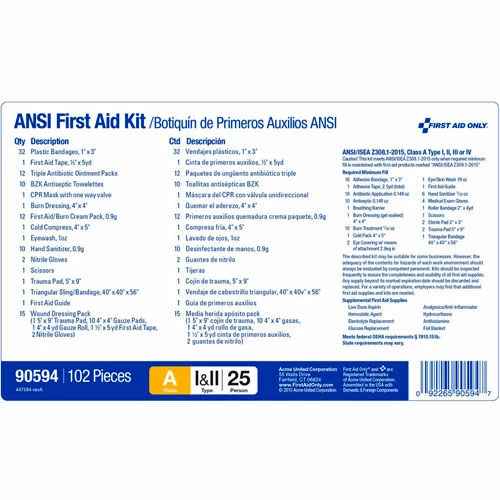 Nylon zip up case comes with carrying handles and is wall mountable. Contents meet the 2015 ANSI Class A requirements and are sufficient to treat 25 or more people.