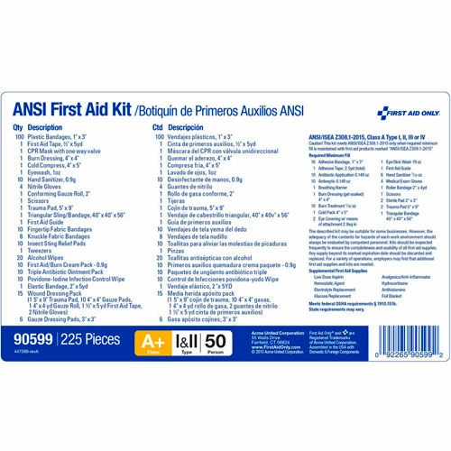Nylon zip up case comes with carrying handles and is wall mountable. Contents meet the 2015 ANSI Class A requirements and are sufficient to treat 50 or more people.