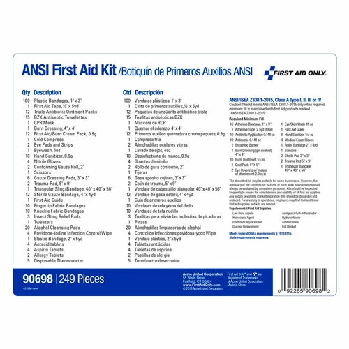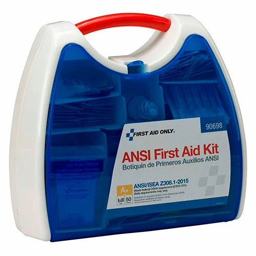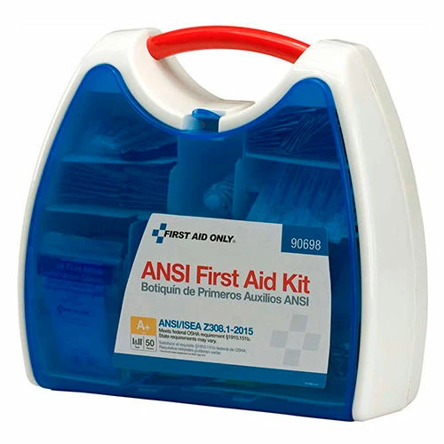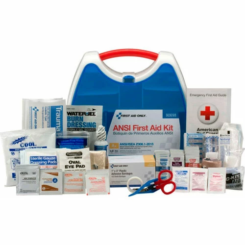 Innovative plastic case comes with a carrying handle and is wall mountable. Contents exceed the 2015 ANSI Class A requirements and are sufficient to treat 50 or more people.