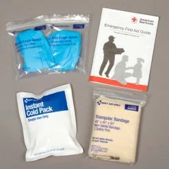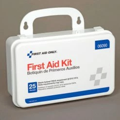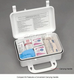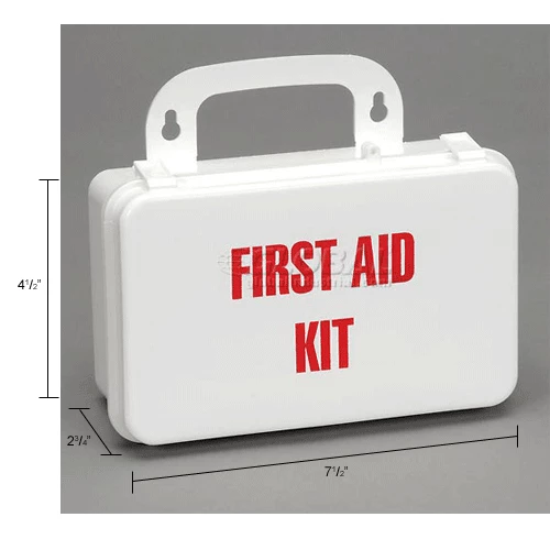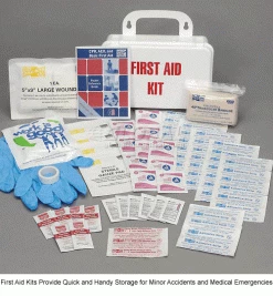 First Aid Kits feature a variety of supplies to ensure first aid can safely be administered for minor injuries. Kits are housed in a clearly-marked plastic case with handle for carrying or hanging.