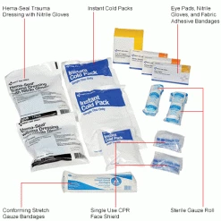 - (6) Hema-Seal 8×10 Trauma Pad in 4″ x 4yd gauze, 2 Nitrile Exam Gloves