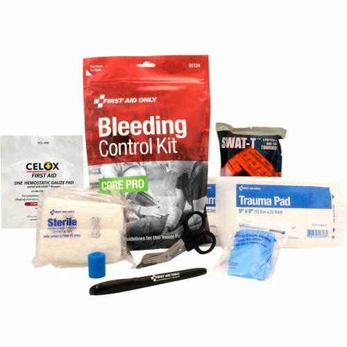 The station includes four (4) Core Pro Bleeding Control Kit (91134), each kit includes: (1) Easy Tear-open Bag; (1) SWAT-T Tourniquet; (1) Back-up Elastic Tourniquet; (1) Hemostatic Blood-Clotting Gauze Pad, 4″x4″; (1) Sterile Hema-Seal Dressing Wrap; (2) Trauma Pad Dressing, 5″x9″; (2) Protective Nitrile Exam Gloves; (1) Bandage Shears; (1) Marker to note tourniquet time; (1) Bleeding Control Product Usage Guidelines.