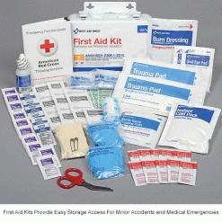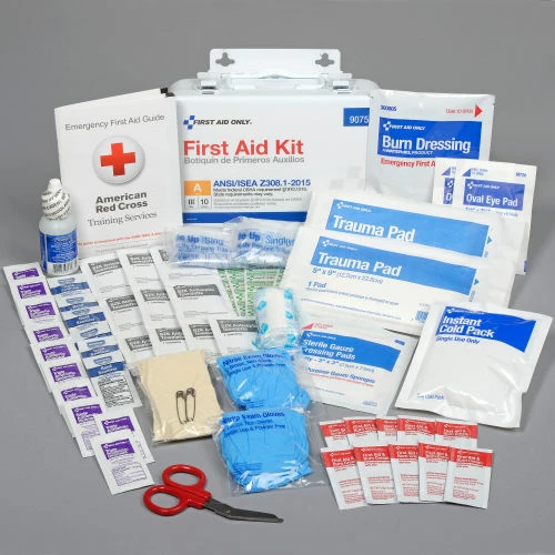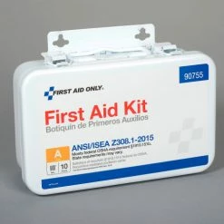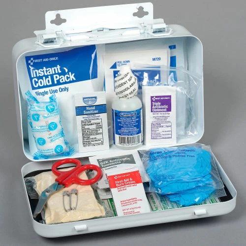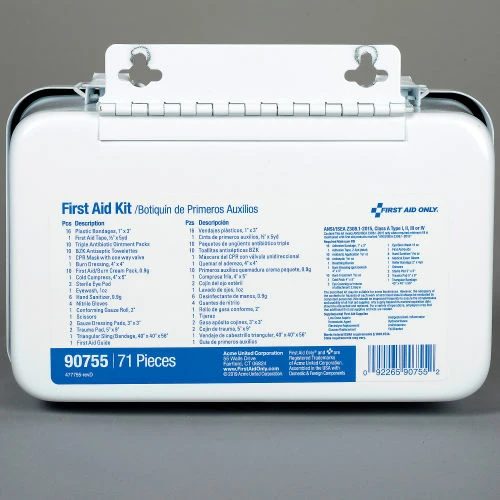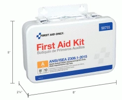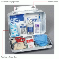 - Contains 71 Pieces.Case size of 5″ x 3″ x8″. Compact First Aid Kit, ANSI/ISEA Z308.1-2015. Perfect for a work van or jobsite. The weatherproof case makes it ideal for landscapers and contractors.Weatherproof metal case comes with a carrying handle and is wall mountable. Contents exceed the 2015 ANSI Class A requirements and are sufficient to treat 10 or more people. This compact, 10 person, First Aid Kit is perfect for so many purposes. Keep in your home, your car or small office. This is a bulk kit so the contents fit more loosely in the kit so its best to open when it is laying flat and not haning up.