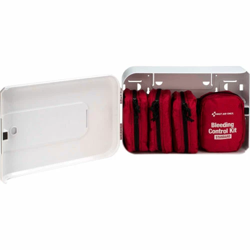 The SmartCompliance Complete Bleeding Control Station is designed for multiple-person bleeding traumas that might occur in a variety of locations including workplaces or public spaces. This clearly labeled, aesthetically-appealing wall-mountable cabinet has a push-plate door opening so there is no fumbling with locks and latches in a hurry. The SmartCompliance Bleeding Control Cabinet includes four Standard Bleeding Control Kits (part number 91059). Each pouch contains proven bleeding control tools including a windlass tourniquet with instructions, protective gloves and plenty of wound dressings.