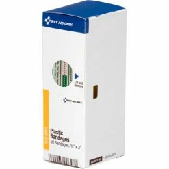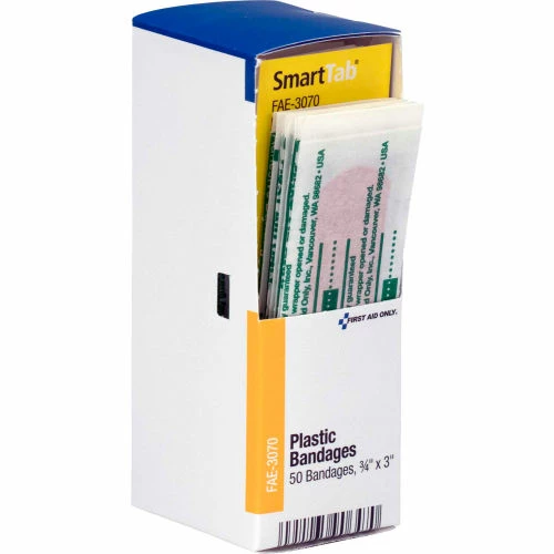 SmartCompliance Refill with 50, 3/4″ x 1″ plastic bandages per box. The plastic adhesive bandages are ideal for minor cuts, abrasions and puncture wounds. Made with a pliable plastic, each bandage is ventilated to aid in the natural healing process. They effectively protect scrapes and cuts while the non-stick pad absorbs drainage. The breathable backing repels water and dirt.
