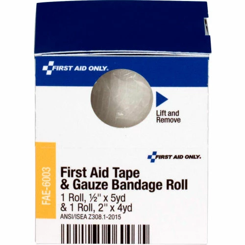 SmartCompliance Refill with 1 roll of 2″ conforming gauze roll and 1, 1/2″ x 5yd First Aid Tape roll per box. Hold dressings in place with conforming gauze that won’t cling to hair or skin. Soft and absorbent, the gauze can hold dressing on wounds, yet provide flexibility for movement if needed. The roll contains approximately 4 yards of conforming gauze and the 2″ width helps cover wounds quickly. holds bandages in place or secures other dressings that mold to body contours. The paper tape keeps the gauze securely in place and is easy to remove without pain or shredding of the tape.