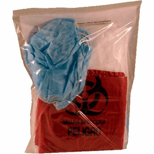 Polybagged BBP Clean Up kit (gloves, towel, powder, antimicrobial wipe, scraper, disinfecting towelette, twist tie, cap, face mask with eye shield, shoe covers, biohazard bag, instructions) – contained in Resealable Bag. Resealable.