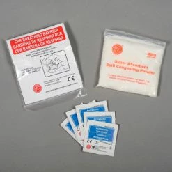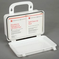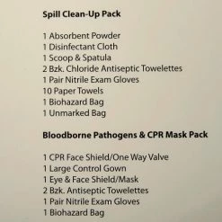 Spill Clean-Up Pack: 1 Absorbent Powder; 1 Disinfectant Cloth; 1 Scoop and Spatula; 2 BZK Chloride Antiseptic Towelettes; 1 Pair Nitrile Exam Gloves; 10 Paper Towels; 1 Biohazard Bag; 1 Unmarked Bag Bloodborne Pathogens & CPR Mask Pack: 1 CPR Face Shield/One Way Valve; 1 Large Control Gown; 1 Eye and Face Shield/Mask; 2 BZK Antiseptic Towelettes; 1 Pair Nitrile Exam Gloves; 1 Biohazard Bag.