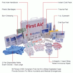 Provide a quick, handy storage solution for minor accidents and medical emergencies with the Global Industrial First Aid Kit. These first aid kits are encased with cabinet housing for secure, organized storage of all first aid supplies. They can be wall mounted or moved with an easy carry handle and are ideal for any small office setting. 1-Year Limited Warranty.