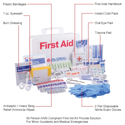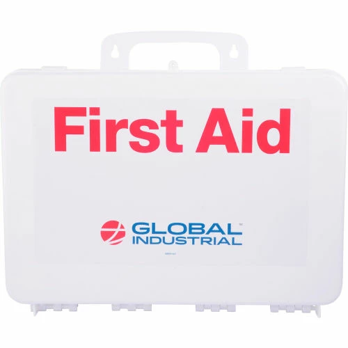 Easily store medical supplies with the Global Industrial#&153; First Aid Kit. These first aid kits are encased with plastic cabinet housing for secure, organized storage of all first aid supplies. Can be wall mounted or movable with an easy carry handle. Perfect for any small office setting. 1-Year Limited Warranty.