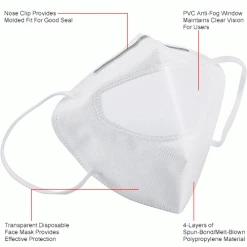 Lightweight construction conforms easily over the profile to assure user comfort is consistent. Comfortable ear loops securely attach mask to maintain a firm position throughout movement. Metal nose clip is easy to pinch, allowing for quick form fitting adjustments. Masks are constructed from 4-layers of spun-bond/melt-blown polypropylene with PVC anti-fog window. Each masks in this bundle is individually packaged to ensure no cross contamination during user distribution.