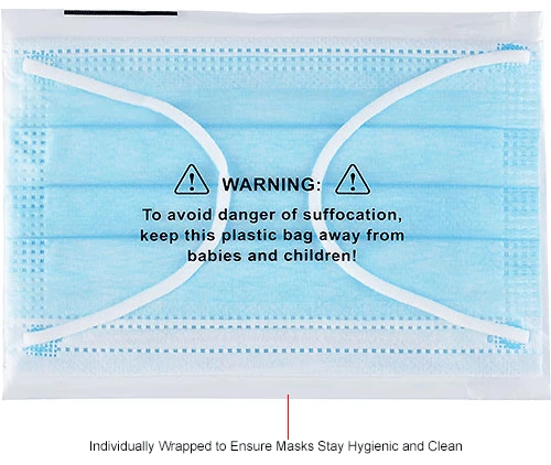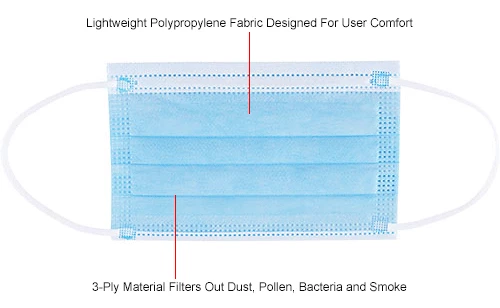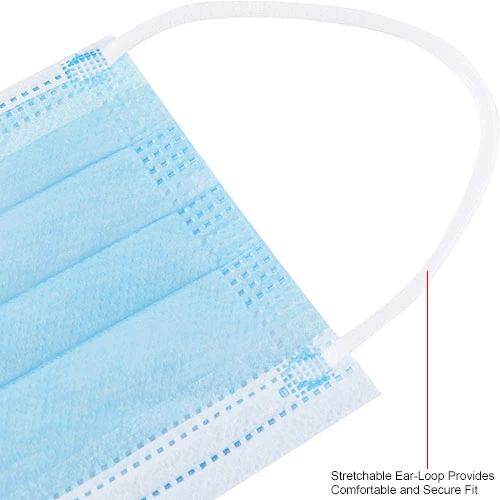 These face masks provide nose and mouth protection against airborne particulates including dust, debris, pollen, and more. The lightweight polypropylene construction is designed for user comfort with no uncomfortable pressure points. Includes dual knitted ear loops for mask positioning and stability. Disposable design, 100% Polypropylene. Mask is white on the inside and blue on the outside to ensure it is easy to properly wear. Masks are individually packaged per bag and ship 50/Box.