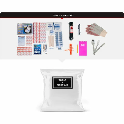 Tools and First Aid: These tools can be useful when you need help with navigation, transport, personal protection, or shelter. A first aid kit can be used to treat minor injuries and protect against more serious health threats in a disaster.