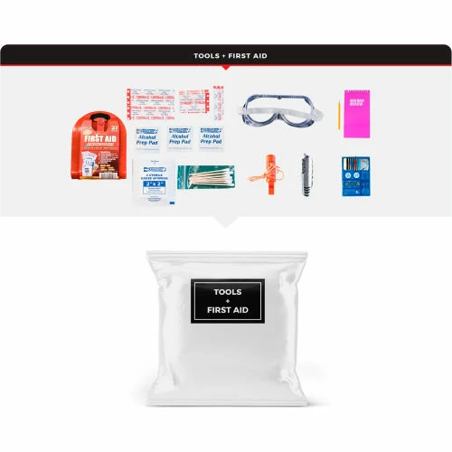 Tools and First Aid: These tools can be useful when you need help with navigation, transport, personal protection, or shelter. A first aid kit can be used to treat minor injuries and protect against more serious health threats in a disaster.