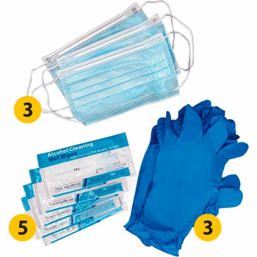 | Includes | (3) Surgical Masks (3) Pairs Non-Latex Gloves (5) Sanitizing Wipes |
