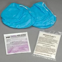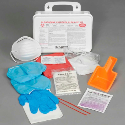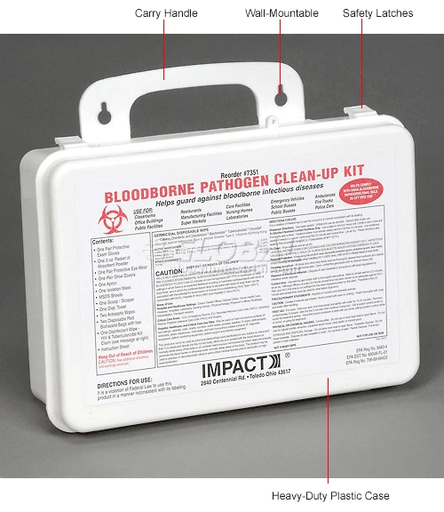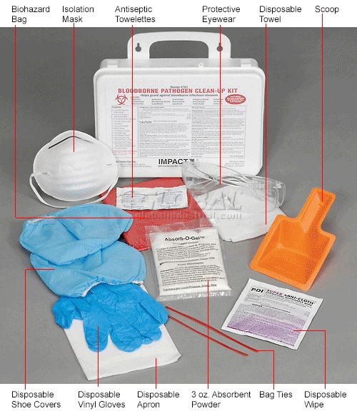 Complies with OSHA Standard 29 CFR 1910.1030 for cleaning blood. Heavy-duty plastic case with safety latch and handle; can be wall mounted. Includes one pair disposable vinyl gloves, one pair disposable shoe covers, one disposable apron, two scoop/scrapers, two red biohazard bags with ties, one disposable towel, one pair protective eyewear, one isolation mask, one 3-oz. packet of absorbent powder, two antiseptic wipes, one disposable wipe with HIV-1 tuberculocidal claim, Material Safety Data Sheets and instructions.