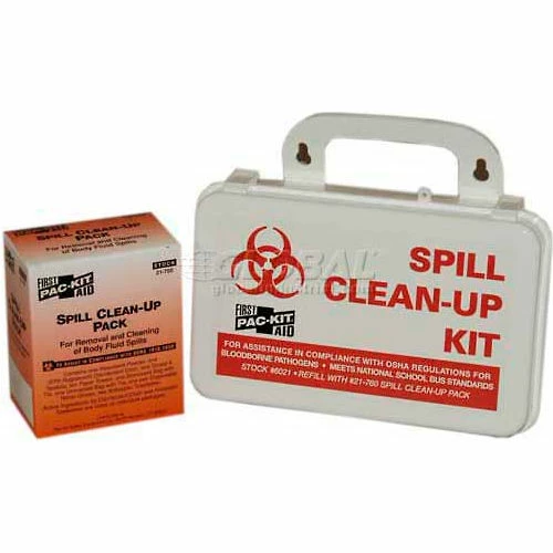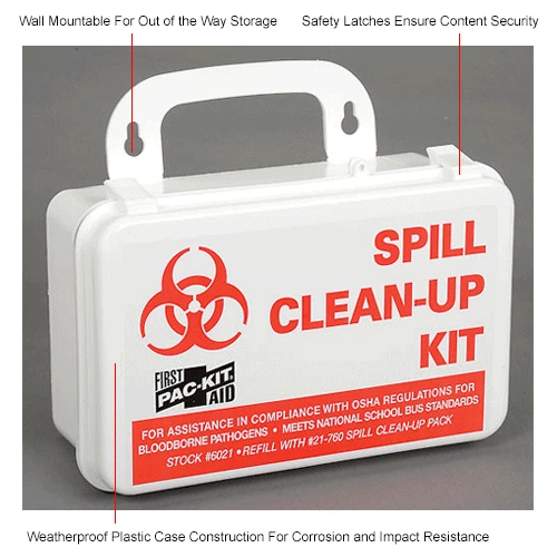 Biohazard (also called biological hazards) cleanup kits may comply with standards such as Occupational Safety and Health Administration (OSHA) Standard 1910.1030 concerning blood borne pathogens and the cleanup of infectious waste. The kits are used in facilities such as hospitals, doctor’s offices, and health care clinics. They are also used by cleaning crews specializing in trauma and crime scene clean up.Includes