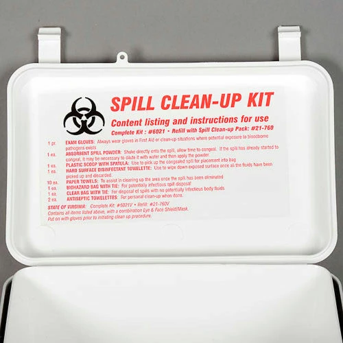The kit comes in a weatherproof steel case with a carrying handle and holes for mounting on a vertical surface. Biohazard cleanup kits provide an assortment of cleaning tools and disposable personal protective equipment to safely clean up potentially infectious bodily fluids such as vomit, spit, blood, or urine. The personal protective equipment components of the kit help minimize exposure of personnel to potentially harmful substances.