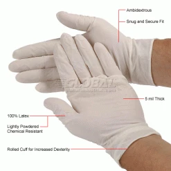 5 mil thick ambidextrous, rolled cuff gloves supply a high degree of dexterity with the strength and comfort of 100% latex. Snug and secure fit. Made with USDA approved materials (safe for food handling). Sold 100 gloves per box. Lightly powdered for easy donning.