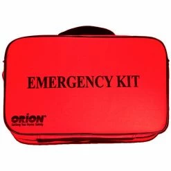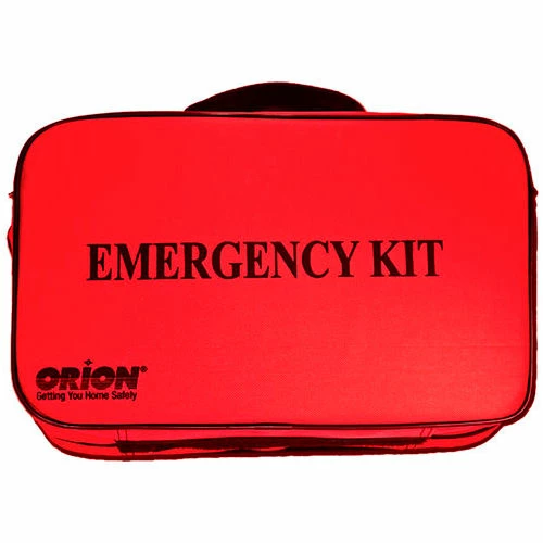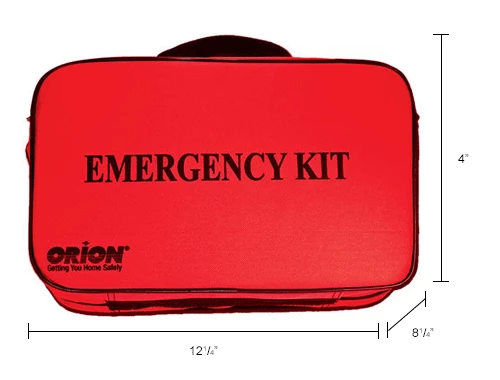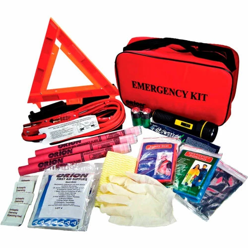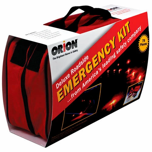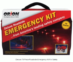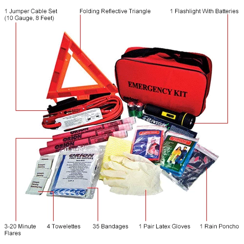 flares, hi-visibility triangle flashlight, batteries, thermal blanket, bandages